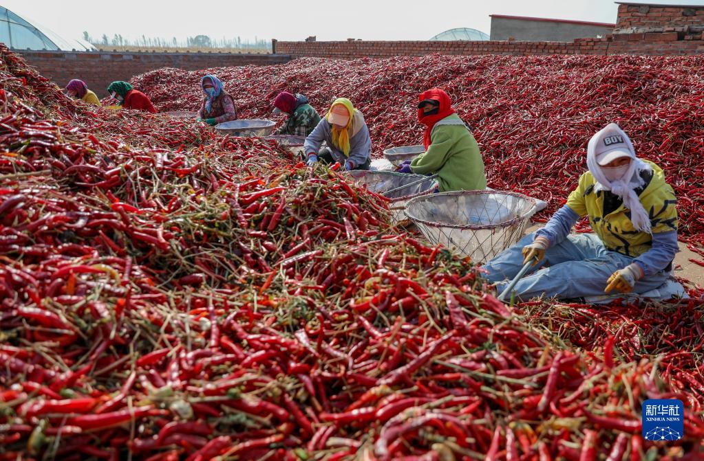 10月25日,在開(kāi)魯縣東風(fēng)鎮東方紅村,工作人員分揀處理紅干椒。