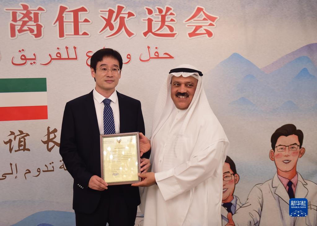 10月24日,在科威特首都省,中國援科醫療隊隊長(cháng)王振華(左)在離任歡送會(huì )上接受自然康復醫院院長(cháng)薩拉赫的感謝信。新華社記者 尹炣 攝