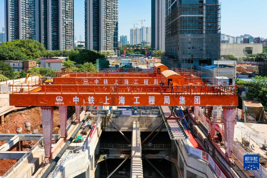 10月26日,施工人員在廣州地鐵11號線(xiàn)南石路站工區吊裝軌排(無(wú)人機照片)。