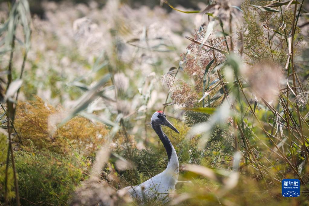 一只丹頂鶴在遼河口國家級自然保護區覓食(2022年9月28日攝)。