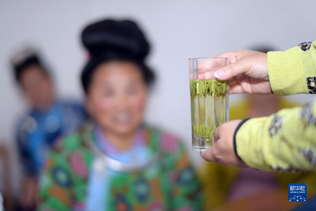10月26日,在丹寨縣興仁鎮擺泥村,當地種茶能手向村民展示茶葉的沖泡效果。
