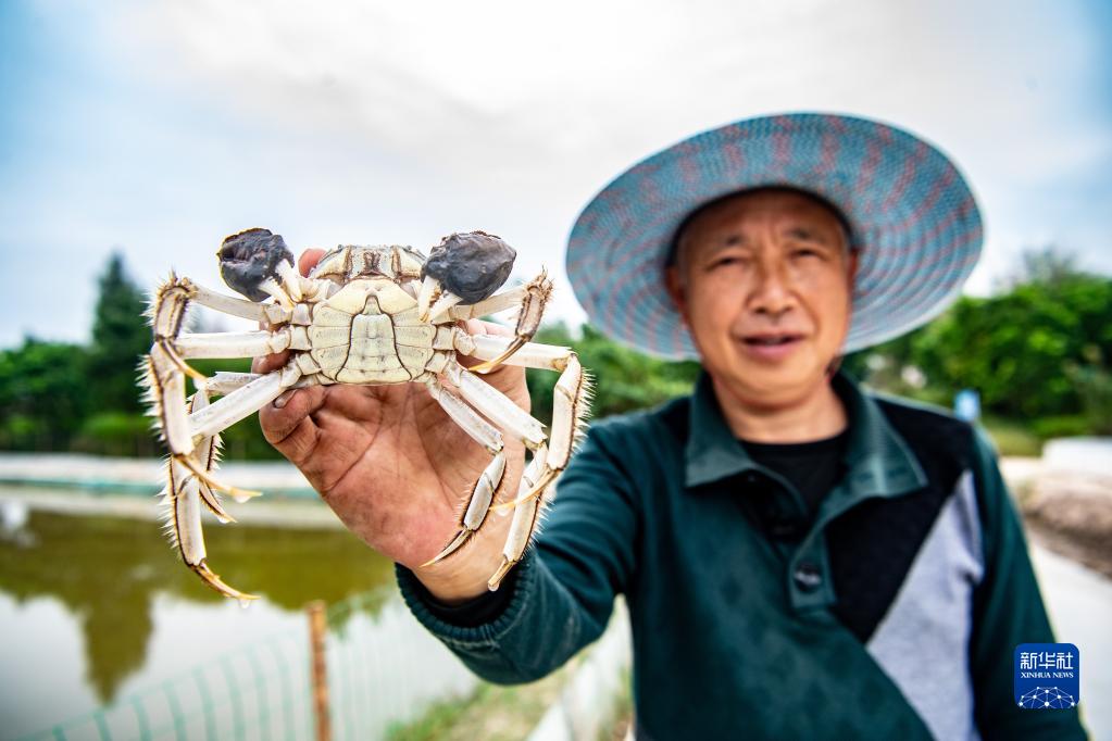 在重慶市合川區龍市鎮缽耳村的稻蝦蟹養殖基地內,種養戶(hù)在展示稻蟹(2022年10月12日攝)。
