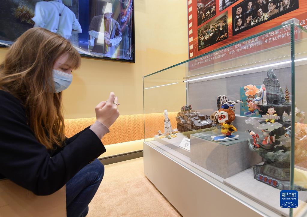 10月27日,外國嘉賓在參觀(guān)“奮進(jìn)新時(shí)代”主題成就展時(shí)拍攝展柜內的卡通玩具。新華社記者 李賀 攝