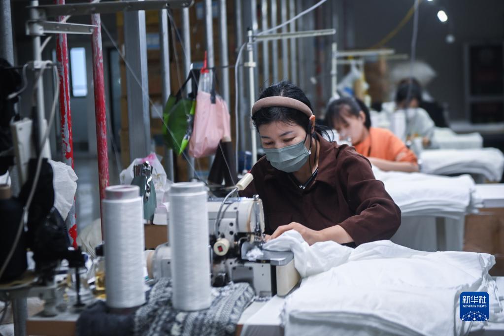 10月27日,在浙江省諸暨市大唐街道的一家專(zhuān)業(yè)生產(chǎn)拉絨打底褲產(chǎn)品的企業(yè)車(chē)間內,工作人員在加工拉絨打底褲。