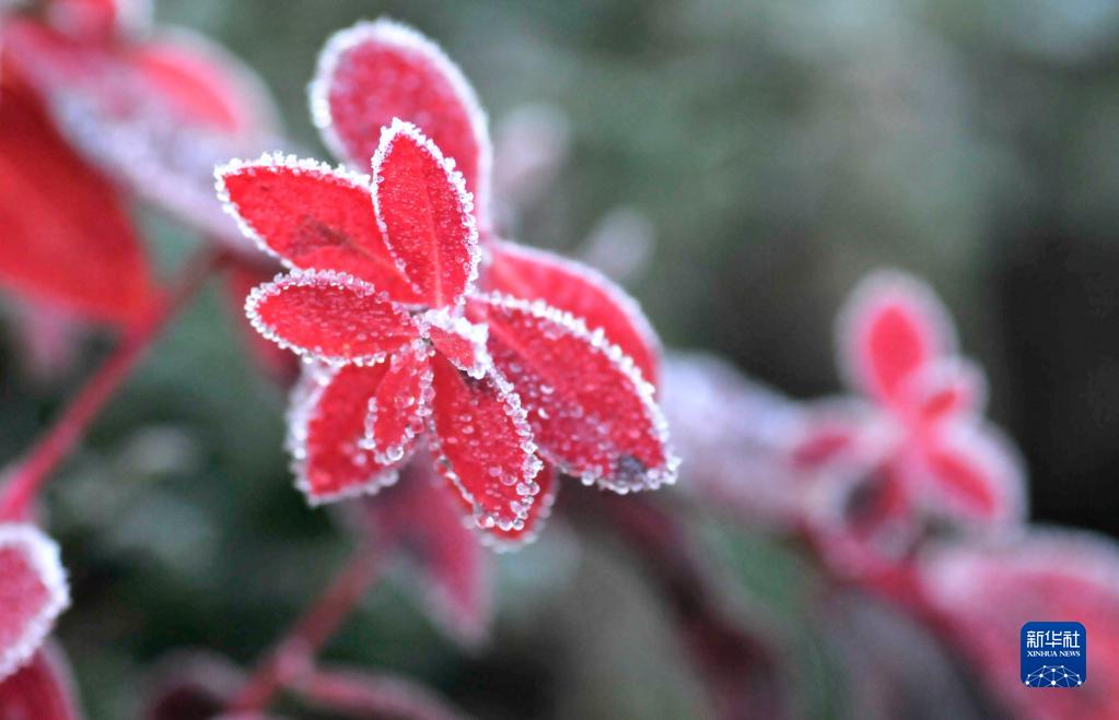10月16日,在云南省迪慶藏族自治州香格里拉市建塘鎮,植物葉子上掛著(zhù)白霜。