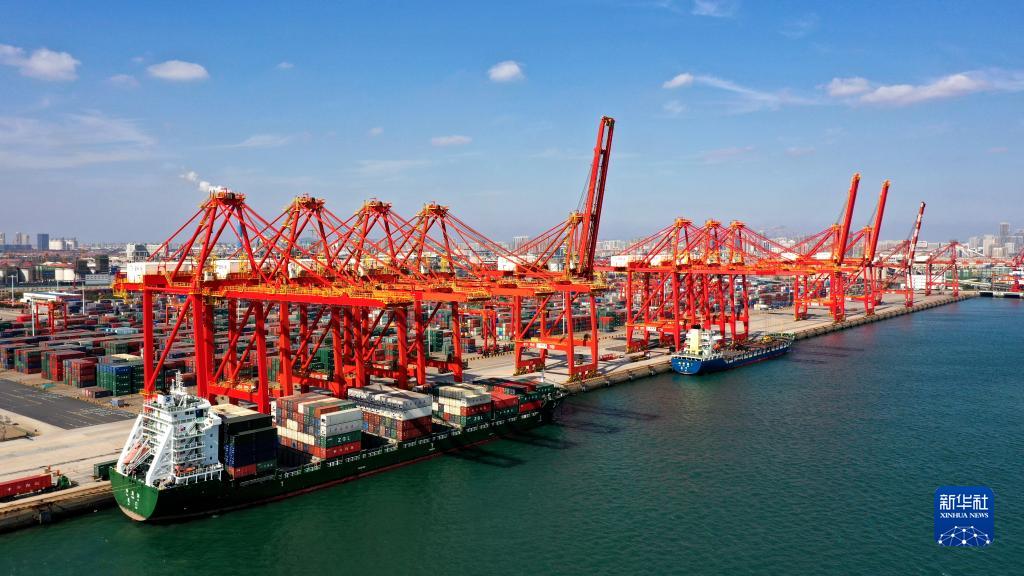 10月28日在山東港口日照港集裝箱碼頭拍攝的作業(yè)場(chǎng)景(無(wú)人機拍攝)。