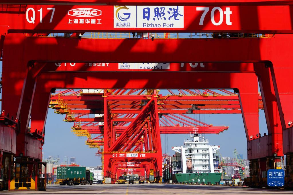 10月28日,在山東港口日照港集裝箱碼頭,貨輪在裝載集裝箱。