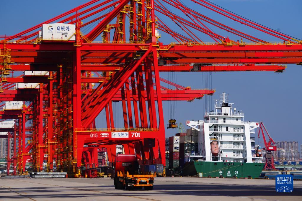 10月28日,在山東港口日照港集裝箱碼頭,貨輪在裝載集裝箱。