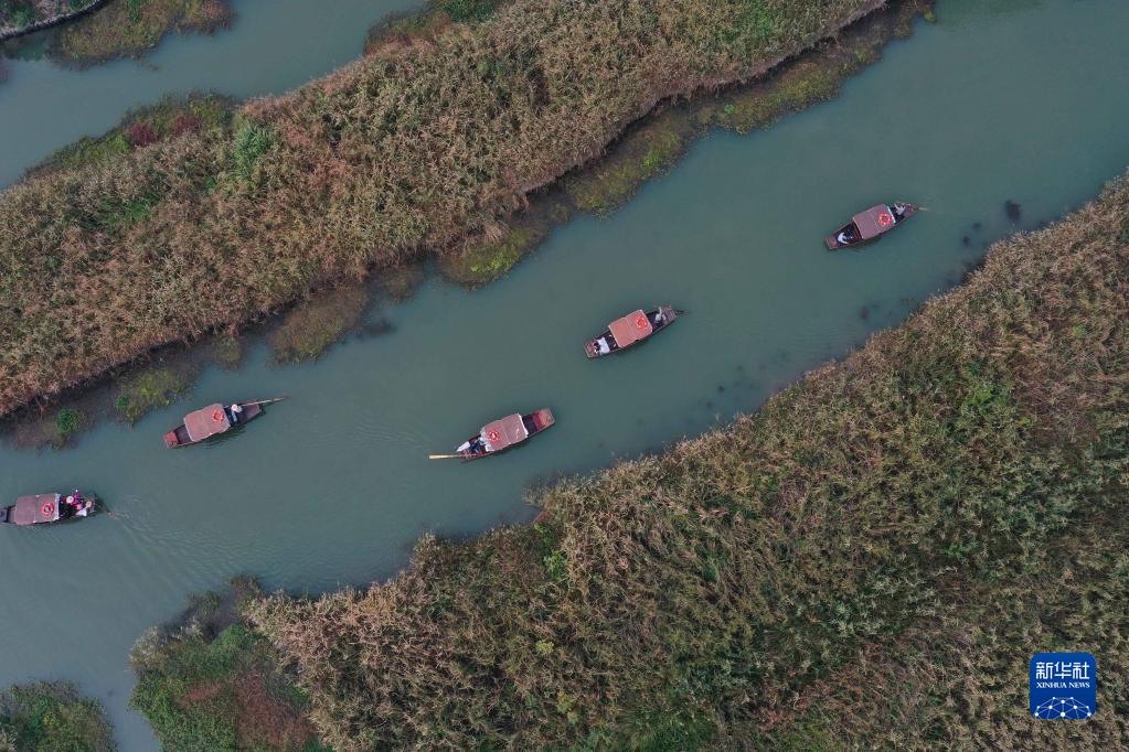 游客乘坐搖櫓船在西溪濕地欣賞蘆花(2019年11月3日攝,無(wú)人機照片)。