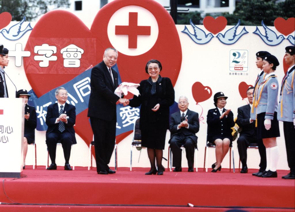 1997年,時(shí)任中國紅十字會(huì )會(huì )長(cháng)錢(qián)正英同志向香港紅十字會(huì )贊助人、時(shí)任香港特首董建華授旗。