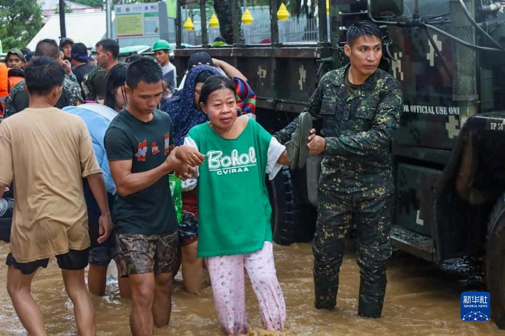 10月28日,在菲律賓馬京達瑙省帕朗,救援人員協(xié)助居民從洪災區轉移。