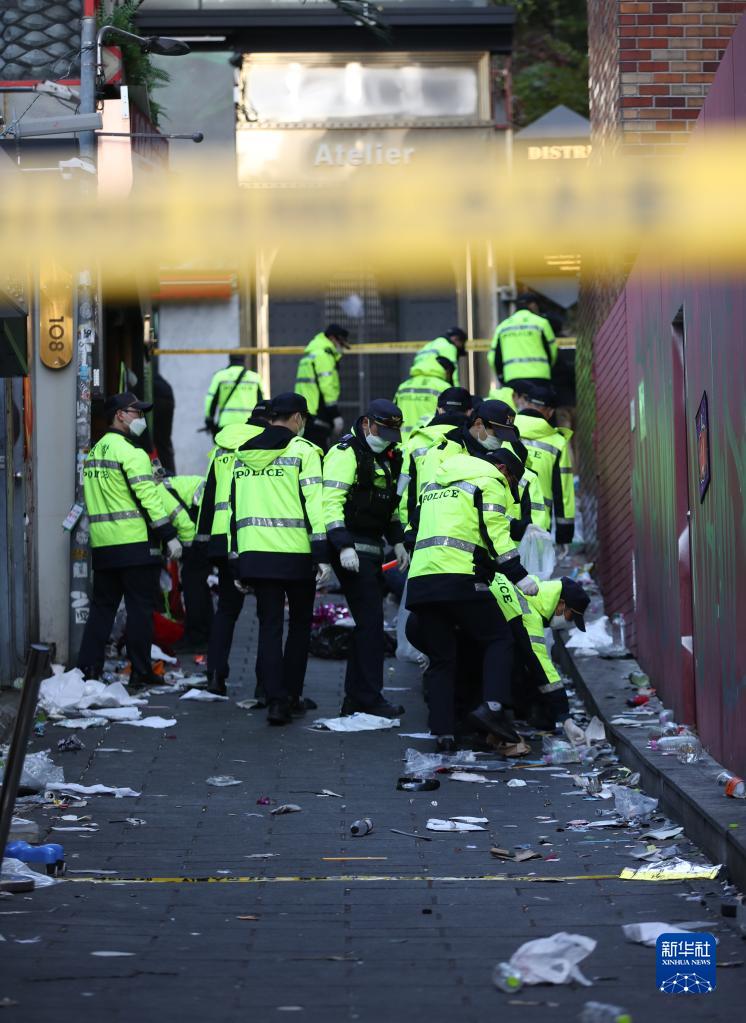 10月30日,警察在韓國首爾市龍山區梨泰院洞一帶的踩踏事故現場(chǎng)工作。