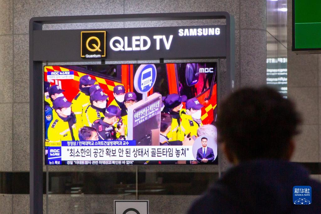 10月30日,在韓國慶尚北道慶州,車(chē)站的電視播放踩踏事故相關(guān)報道。