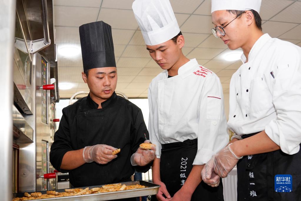 10月27日,重慶市黔江區民族職業(yè)教育中心的老師(左一)在烘焙實(shí)訓課上指導學(xué)生進(jìn)行西式糕點(diǎn)的烘焙。