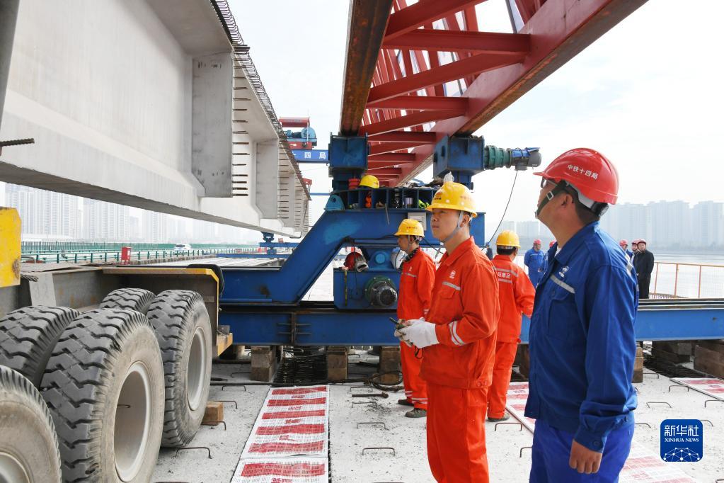 10月30日,青蘭高速公路雙埠至河套段女姑口特大橋施工現場(chǎng),中鐵十四局建設者在吊放最后一片50米T梁。