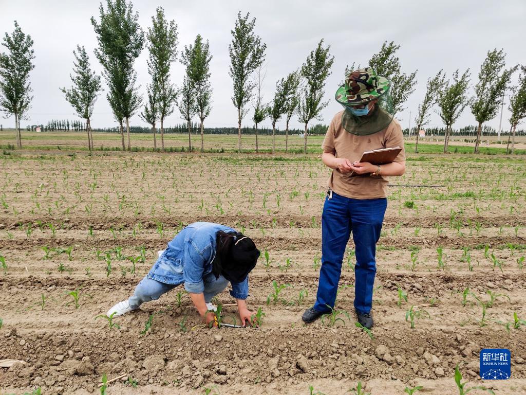 在內蒙古通遼市科爾沁左翼中旗花吐古拉鎮三家子村,農技推廣人員測量玉米株距(2022年6月攝)。