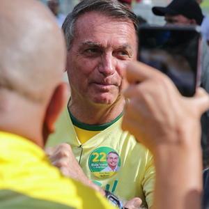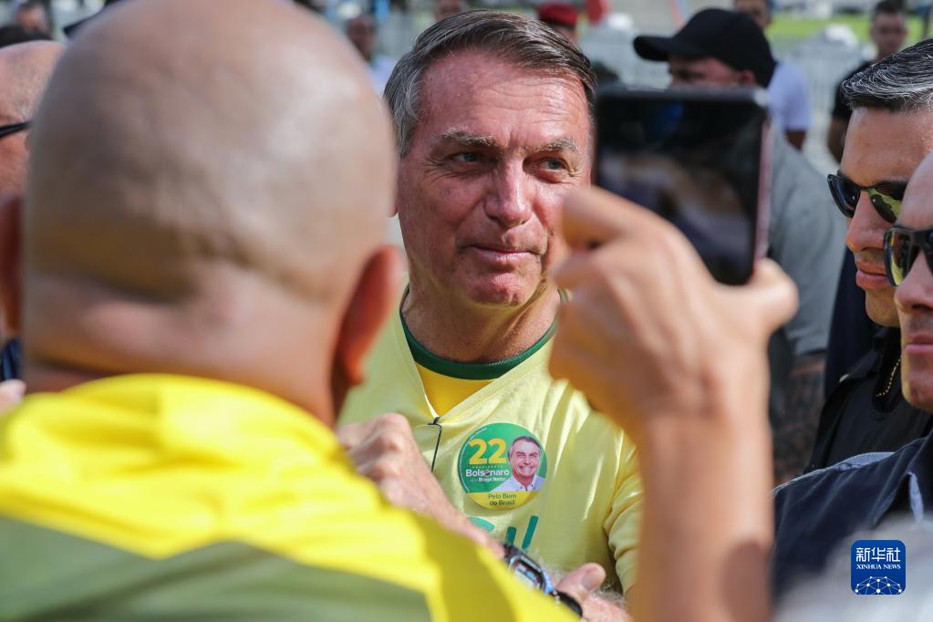 10月30日,巴西右翼陣營(yíng)自由黨候選人、現任總統博索納羅在里約熱內盧一處投票站參加投票前與支持者交談。