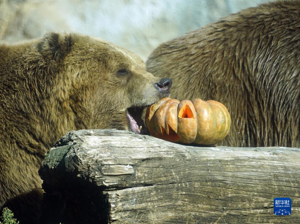 10月30日,在意大利羅馬動(dòng)物園,棕熊享用節日南瓜。