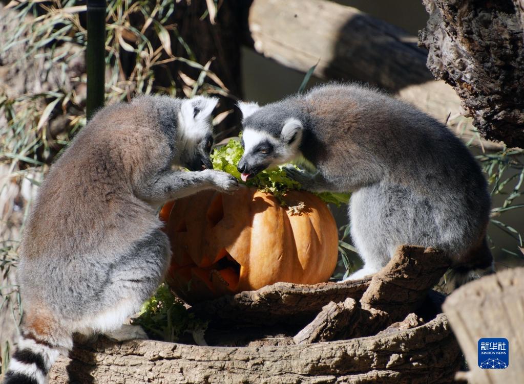 10月30日,在意大利羅馬動(dòng)物園,環(huán)尾狐猴享用節日南瓜。