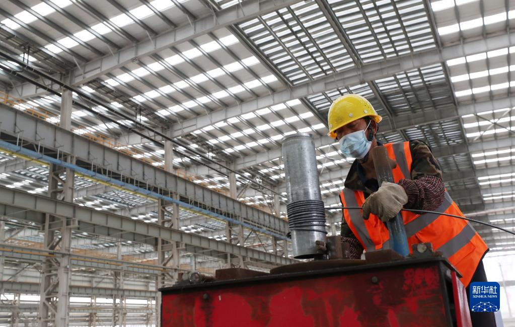 10月31日,工人在中船長(cháng)興造船基地二期工程船體聯(lián)合車(chē)間內制作鋼筋結構件。