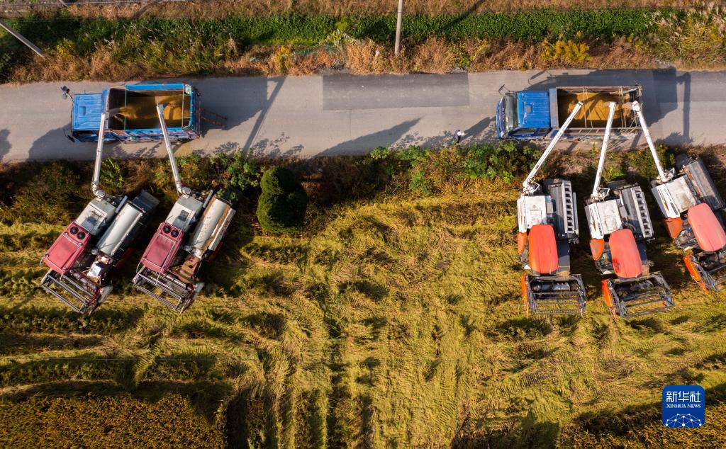 11月1日,在浙江省湖州市吳興區東林鎮保豐村,收割機把收好的晚稻運送到運輸車(chē)上(無(wú)人機照片)。