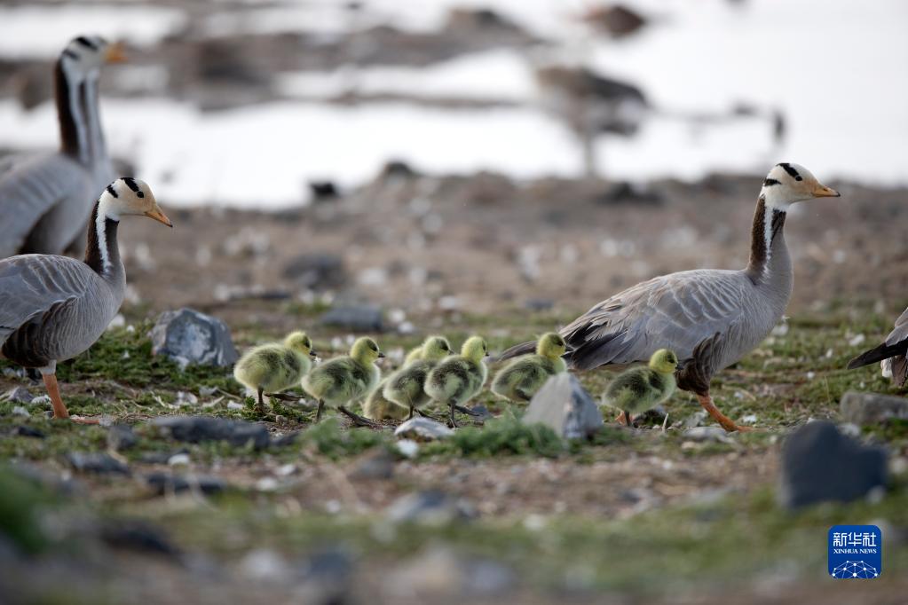 幾只斑頭雁在青海湖鳥(niǎo)島濕地活動(dòng)(2020年6月2日攝)。