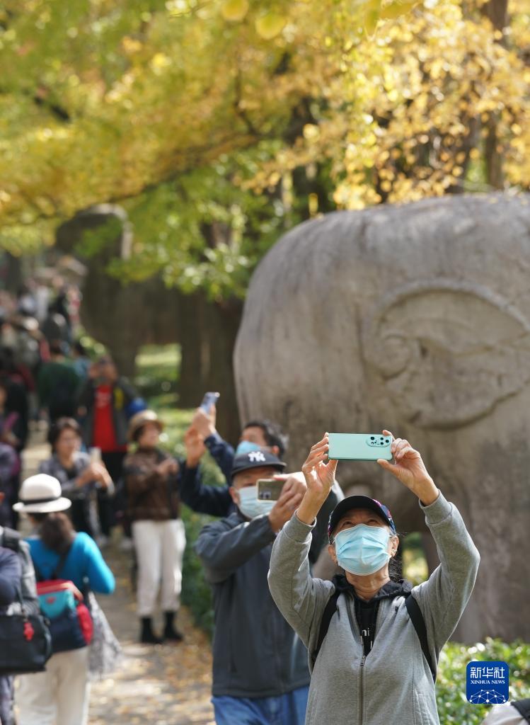 11月1日,游人在南京明孝陵石象路欣賞美景。
