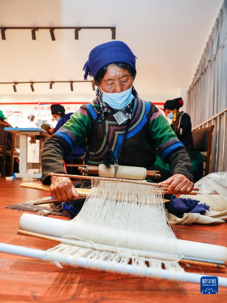 10月27日,在四川省涼山州昭覺(jué)縣南坪社區的彝繡工坊,易地扶貧搬遷到此的婦女在紡織用于制作彝族傳統服裝“查爾瓦”的布匹。這個(gè)彝繡工坊有100多名繡娘,依照訂單制作彝族傳統服飾制品,繡娘們在此靈活就業(yè),既能為家庭增收,又方便照顧家中老人和孩子,每年可增收數千至上萬(wàn)元。