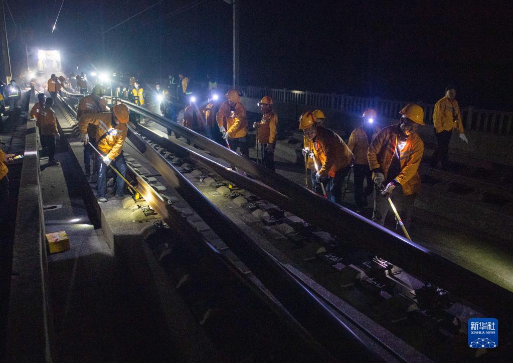 11月2日凌晨,鐵路工人在京廣高鐵株洲西至衡山西區間進(jìn)行換軌施工。