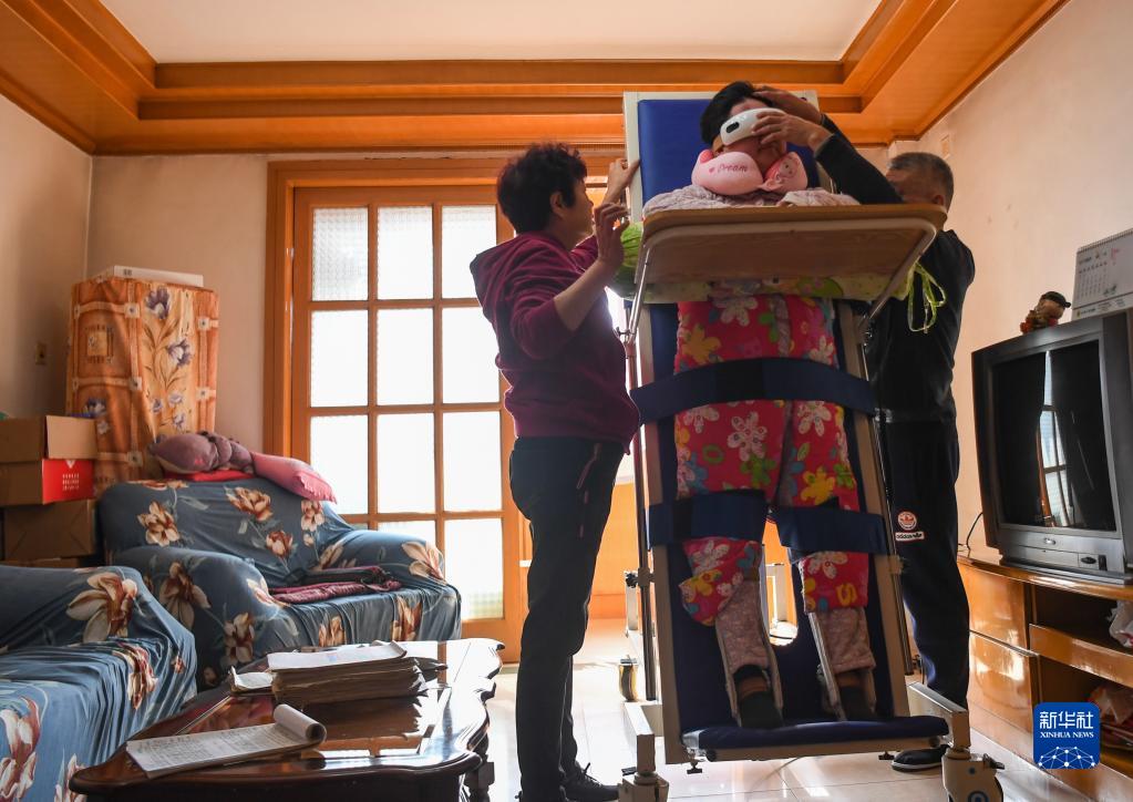華波(右)、胡燕均夫婦幫助女兒進(jìn)行站床康復訓練(11月1日攝)。