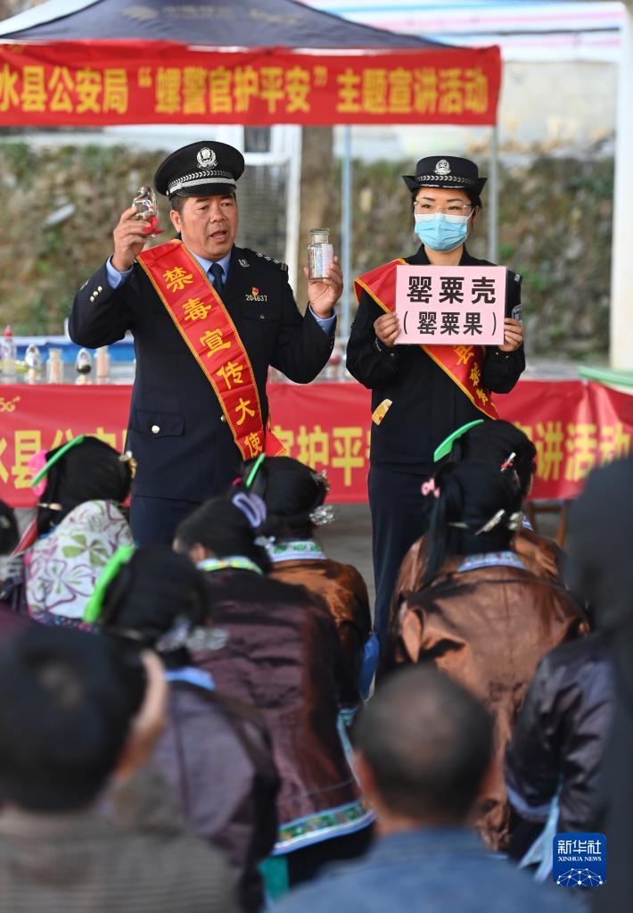 11月2日,在融水苗族自治縣桿洞鄉錦洞村,民警介紹禁毒知識。