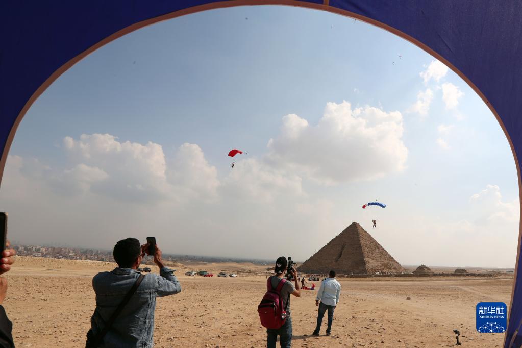 當日,第五屆金字塔國際跳傘節在埃及首都開(kāi)羅附近的吉薩金字塔景區開(kāi)幕,吸引了來(lái)自世界各地的100余名專(zhuān)業(yè)跳傘運動(dòng)員參加。