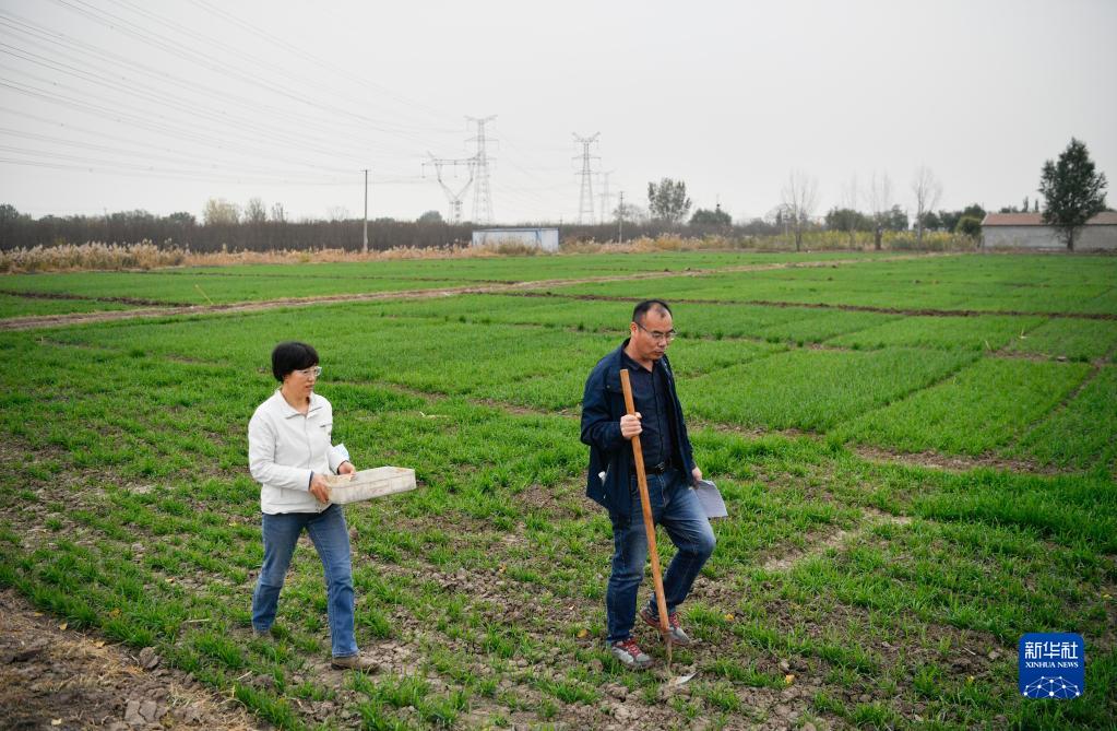 11月2日,在天津市武清區周莊村,時(shí)曉偉(左)在試驗麥田查看苗情。