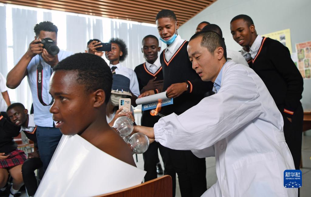 在納米比亞首都溫得和克的毛澤東主席中學(xué)3日的中文課上,第十四批中國援納醫療隊用銀針、火罐作教具,以推拿、做操為內容,讓同學(xué)們在輕松愉悅的學(xué)習中體驗中國傳統醫學(xué)文化。
