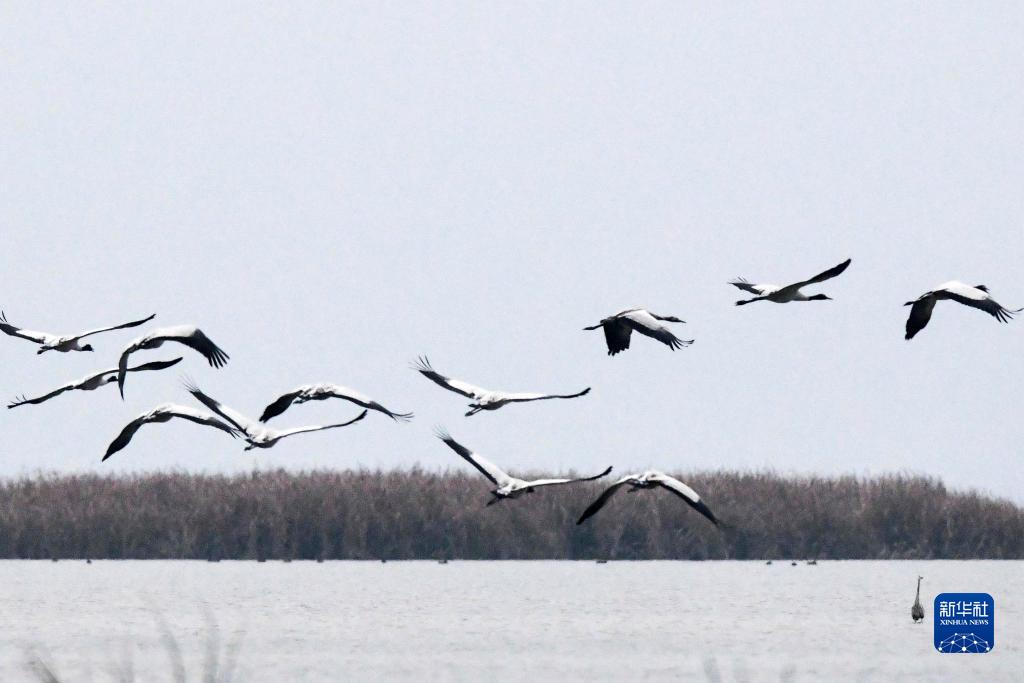 11月4日拍攝的在貴州草海棲息的國家一級保護動(dòng)物黑頸鶴。