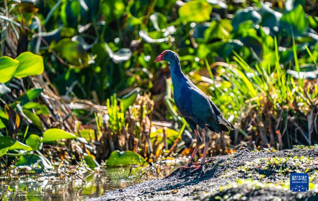 紫水雞在濕地中覓食(10月28日攝)。