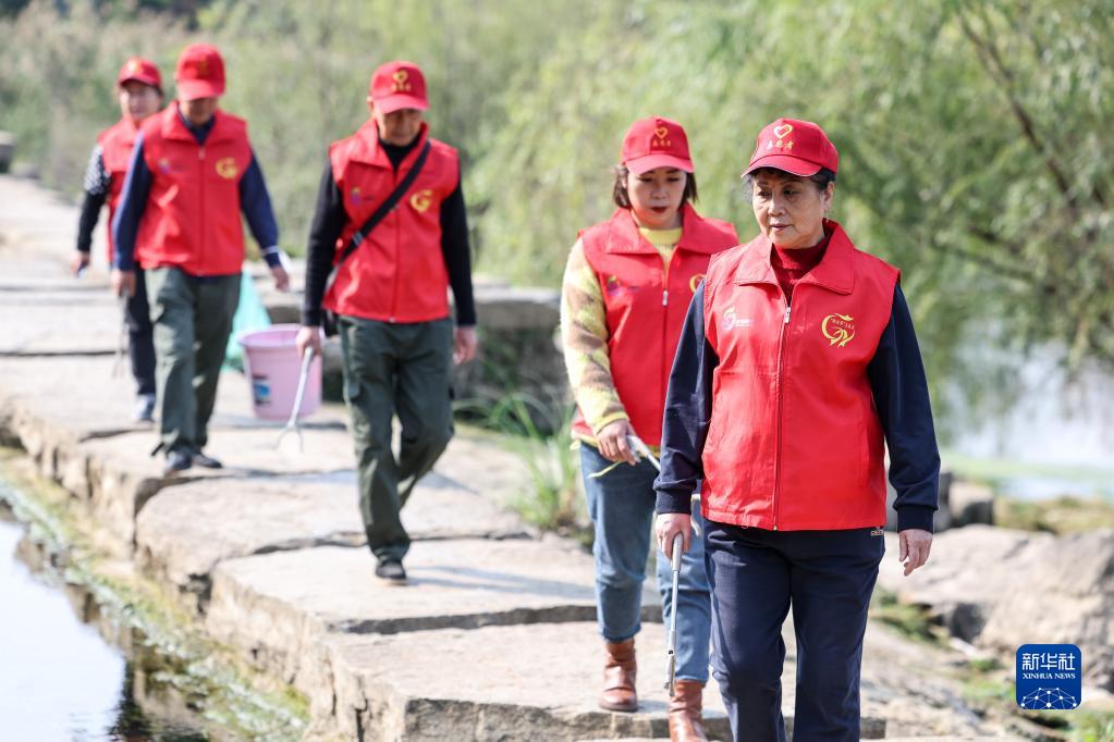 11月4日,在貴州貴陽(yáng),周余慶(前)與志愿者一起在花溪國家城市濕地公園內巡河。