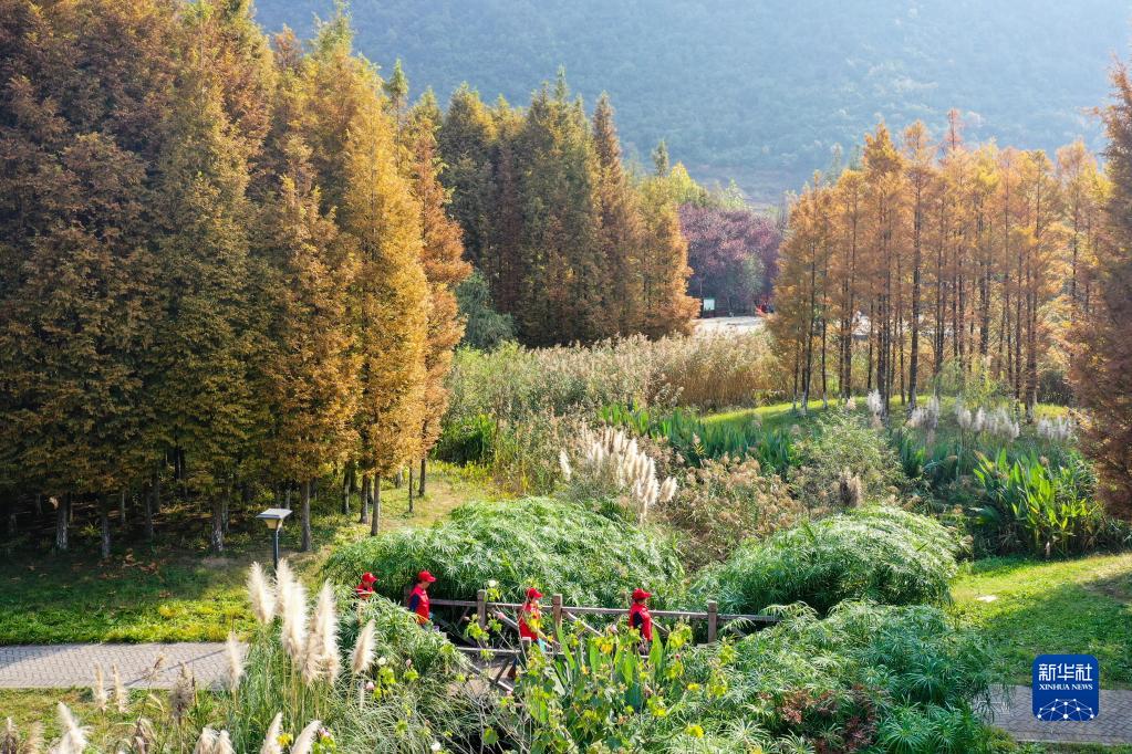 11月4日,在貴州貴陽(yáng),周余慶(右一)與志愿者一起在花溪國家城市濕地公園內巡查(無(wú)人機照片)。