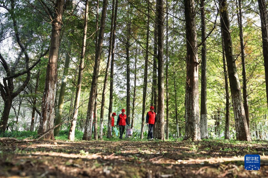 11月4日,在貴州貴陽(yáng),周余慶(右一)與志愿者一起在花溪國家城市濕地公園內巡查。