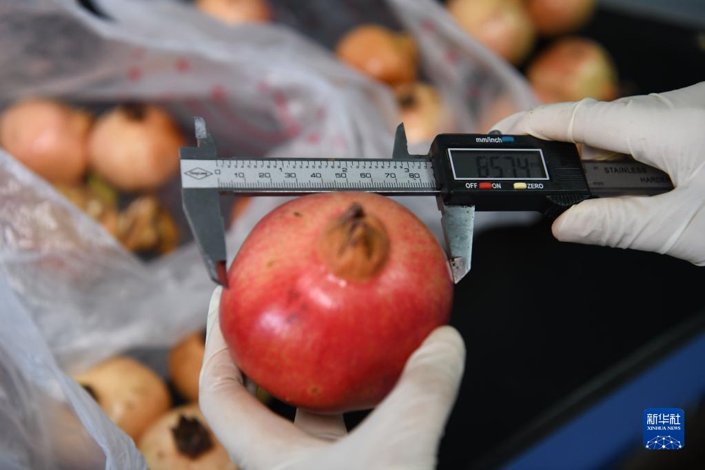11月3日,在安徽省農業(yè)科學(xué)院園藝研究所實(shí)驗室內,石榴創(chuàng )新團隊成員在對石榴進(jìn)行測量。