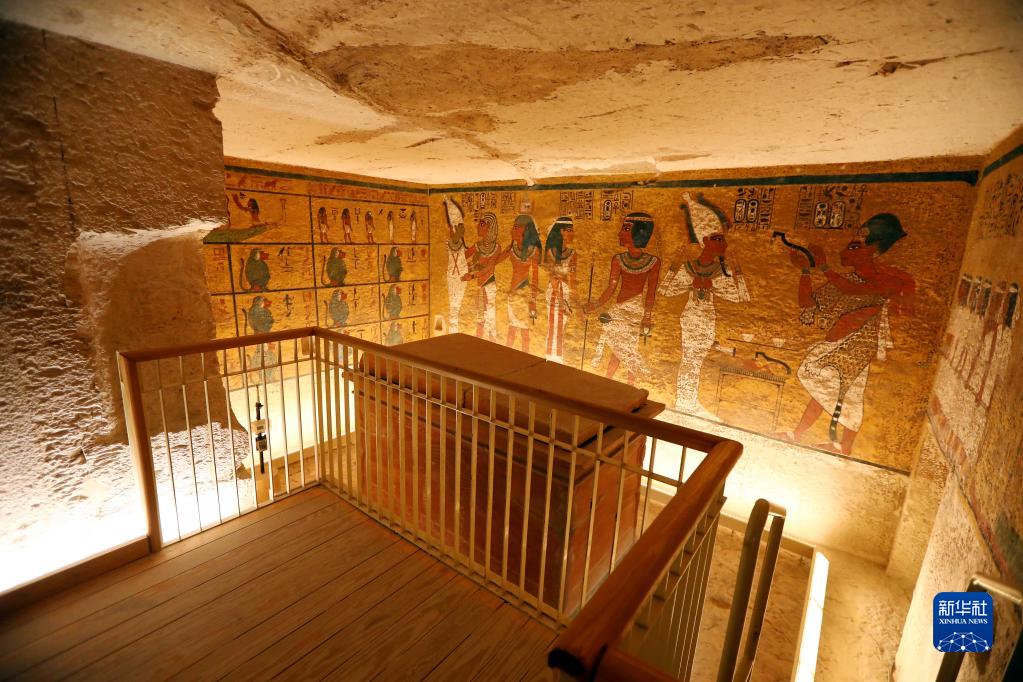 這是11月4日在位于埃及盧克索帝王谷的圖坦卡蒙墓內拍攝的壁畫(huà)和圖坦卡蒙的石棺。