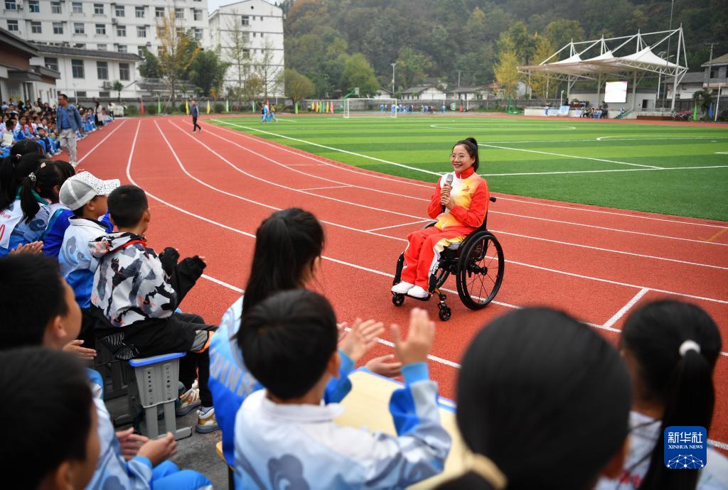 11月3日,在石泉縣城關(guān)鎮中心小學(xué)舉行的校園運動(dòng)會(huì )現場(chǎng),夏江波與孩子們交流。