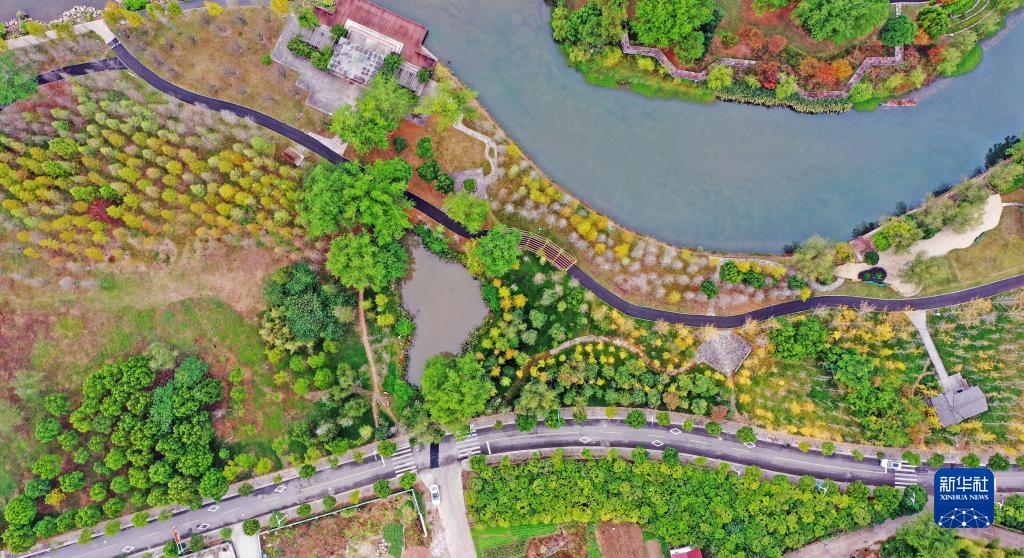 這是11月4日在浙江省臺州市仙居縣神仙居旅游度假區如意湖公園拍攝的秋景(無(wú)人機照片)。 新華社發(fā)(王華斌 攝)