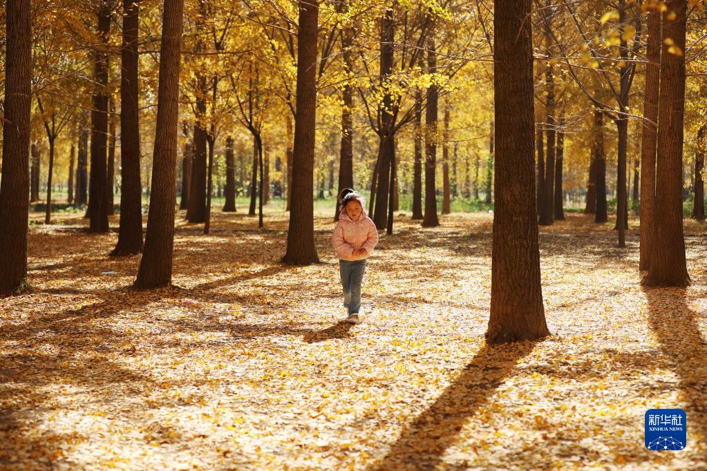 11月4日,小女孩在山東省臨沂市郯城縣勝利鎮賈灣村銀杏林中玩耍。 新華社發(fā)(張春雷 攝)