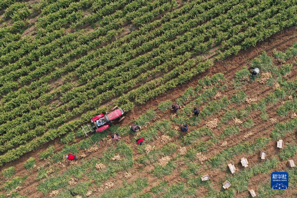 11月5日,河南省寶豐縣商酒務(wù)鎮柳林村村民在田間收獲生姜(無(wú)人機照片)。