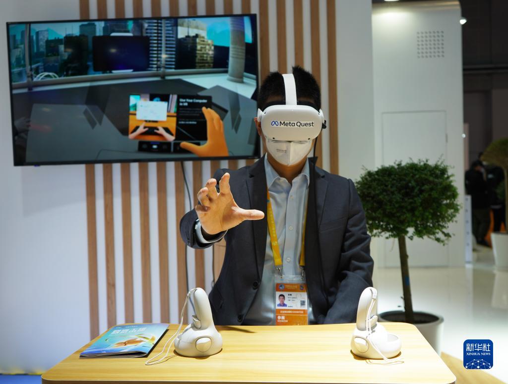 11月5日,參觀(guān)者在第五屆進(jìn)博會(huì )技術(shù)裝備展區人工智能專(zhuān)區體驗元宇宙交互應用。