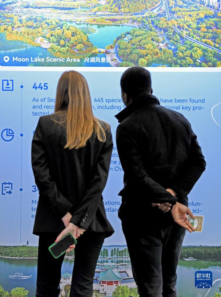 11月5日,在瑞士日內瓦,與會(huì )嘉賓在《濕地公約》第十四屆締約方大會(huì )日內瓦會(huì )場(chǎng)中國展區參觀(guān)。