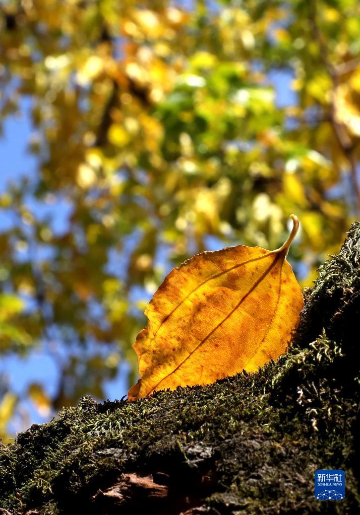 10月31日,在江蘇蘇州怡園內,一片黃葉飄落在樹(shù)干上。