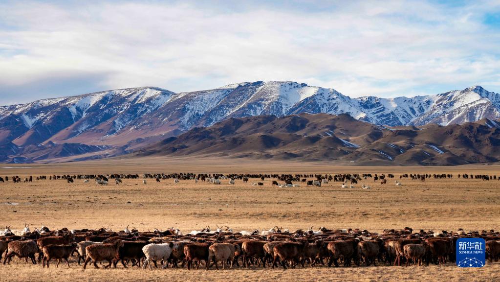 羊群在新疆裕民縣巴爾魯克山冬季牧場(chǎng)上覓食(11月4日攝)。