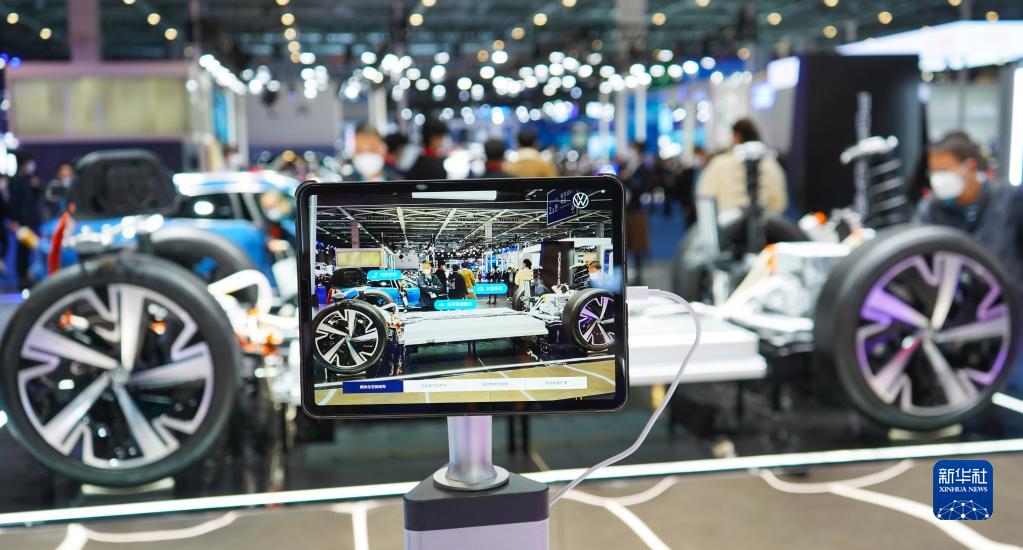 11月6日在第五屆進(jìn)博會(huì )汽車(chē)展區大眾汽車(chē)展臺拍攝的電動(dòng)車(chē)模塊化平臺AR體驗系統。